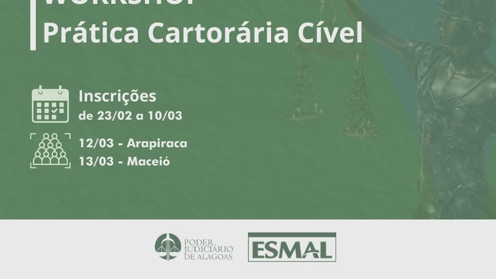 A Escola Superior da Magistratura de Alagoas (Esmal) abre nesta segunda-feira (23) as inscrições para o workshop de Prática Cartorária Cível. O curso tem como objetivo ser um diferencial no aprimoramento dos fluxos de trabalho nas unidades judiciais, com ênfase na prática e melhorias nos procedimentos.