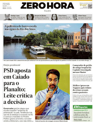 A Zero Hora, de Porto Alegre, informa que o PSD está apostando em Ronaldo Caiado para a corrida presidencial, enquanto Leite critica essa decisão em um cenário já conturbado.