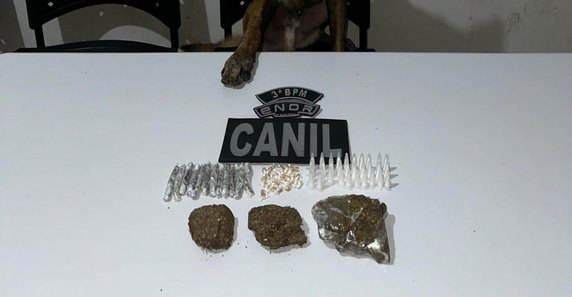 Com o suporte do cão farejador K9 Bill, a equipe inspecionou o local e encontrou bolsas que continham 145 gramas de maconha em tablete, além de 12 cigarros da mesma substância, 32 pinos de cocaína e 26 pedras de crack. Todo o material foi encaminhado à Central de Polícia, onde as medidas legais necessárias foram adotadas.