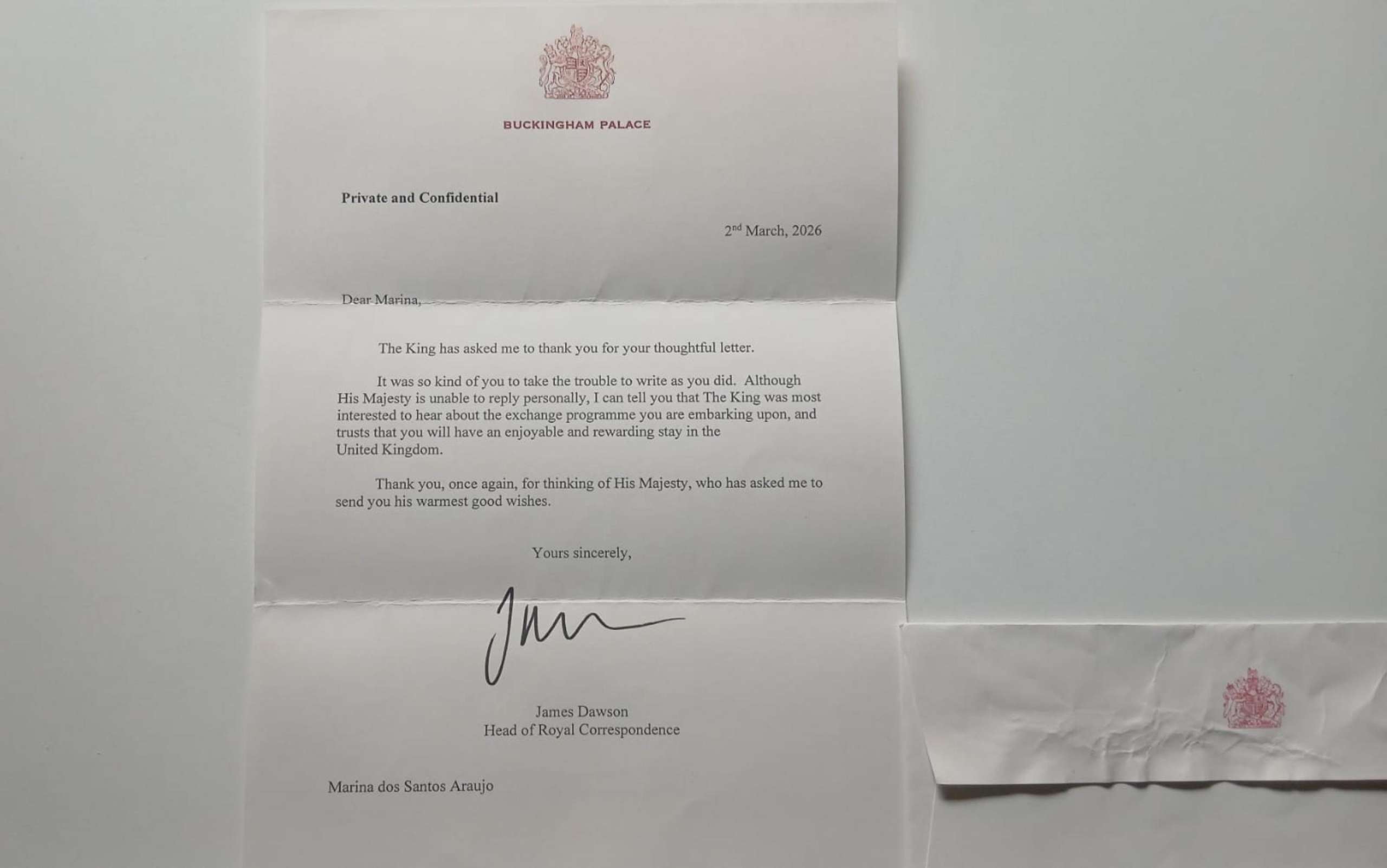Na carta, o Rei expressa: “O Rei pediu-me que lhe agradecesse por sua atenciosa carta. Foi muita gentileza de sua parte dar-se ao trabalho de escrever como escreveu. Embora Sua Majestade não possa responder pessoalmente, posso lhe dizer que o Rei ficou muito interessado em saber sobre o programa de intercâmbio em que você está embarcando e confia que você terá uma estadia agradável e recompensadora no Reino Unido.”