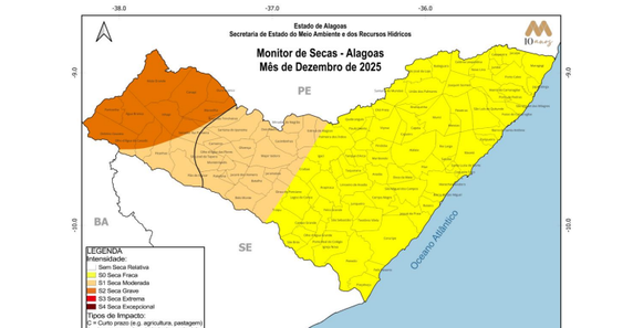 O relatório indica que, em dezembro de 2025, 51,4% do estado estava sob o regime de seca fraca (S0), incluindo partes do Agreste, Zona da Mata, Baixo São Francisco e Litoral. Já 49% do território enfrentou seca moderada (S1), cobrindo regiões do Agreste e Sertão, enquanto 15,07% do estado, especialmente no extremo oeste, estava classificado com seca grave (S2). Essa situação crítica impactou diretamente a disponibilidade de água, situação especialmente preocupante em áreas que dependem de cisternas e pequenos reservatórios.