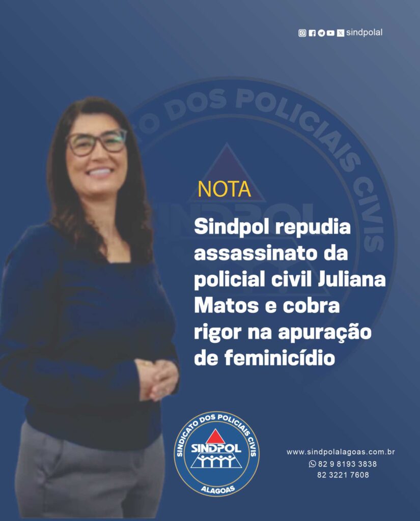 O Sindicato dos Policiais Civis de Alagoas (Sindpol) se une a diversas entidades para expressar seu repúdio ao brutal assassinato da policial civil e professora Juliana Matos de Lima Santiago. O crime, que chocou não só os membros da Polícia Civil, mas a sociedade como um todo, traz à tona a alarmante vulnerabilidade das mulheres policiais e revela que a violência de gênero não se restringe apenas às cidadãs comuns, mas afeta também profissionais da própria instituição policial.